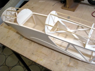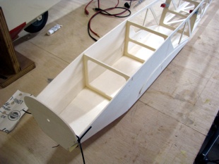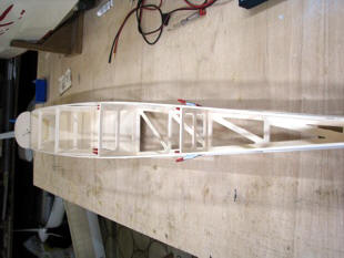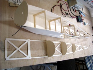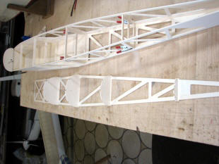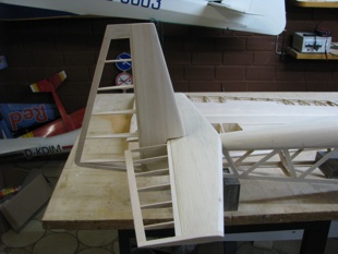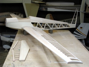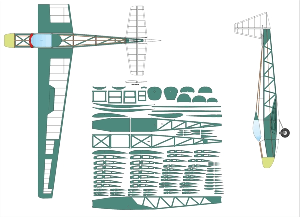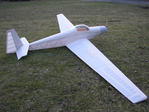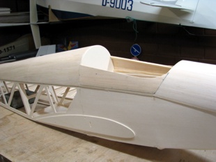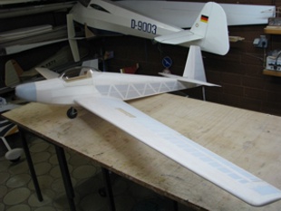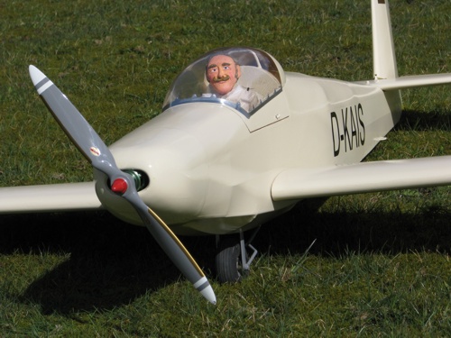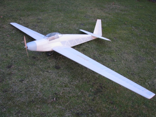 Modell Konstruktion Die Modellkonstruktion basiert auf einige Bilder und einer Vorabzeichnung von Hans-Jürgen Fischer, sie ist in CAD gezeichnet und ist in den Abmessungen und zum Teil mit der Konstruktion der von Kaiser konstruierten K11 übereinstimmend. Das Tragwerk des Rumpfes besteht ausschließlich aus Pappelsperrholz und die Verstrebungen sind genauso angeordnet wie beim Original. Das Tragwerk der Flächen bestehend aus jeweils einem Holm oben und einen Holm unten in Kiefernleiste 10/6-3 in abgestufter Ausführung. Die Rippen sind alle aus 3mm Pappelsperrholz und die Verkastung aus 3 bzw. 2mm Balsa, sowie die Beplankung in 2mm hergestellt. Die Leitwerke sind bis auf die Holme 3mm Pappelsperrholz, komplett aus Balsa erstellt. Daten zum Modell Spannweite : 3,21 m Rumpflänge : 1,62 m Gewicht : 4.100 g Motor : Dymond V-Max 42L an 3.300 4S |