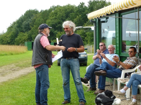 Der Sonntag Morgen fing mit einem deftigen Frühstück bei Uli und Beate, mit Rührei, Wurst, Käse und frischem Kaffe an. Die Sonne schien und der ganze Regen und das Gewitter hatte sich über Nacht verzogen. Um 9°° Uhr wurde der Flugbetrieb wieder fleißig aufgenommen und es kamen noch einige neue Gäste hinzu. Über die Mittagspause wurde schön gegrillt, Kuchen gegessen und Kaffee getrunken. Die Pause wurde auch genutzt um den Pokal, den ich gestiftet hatte, für das schönste Oldtimersegelflugzeug zu vergeben. Wie zu erwarten, erhielt ihn wohlverdient Manfred für seinen schönen Reiher III.
